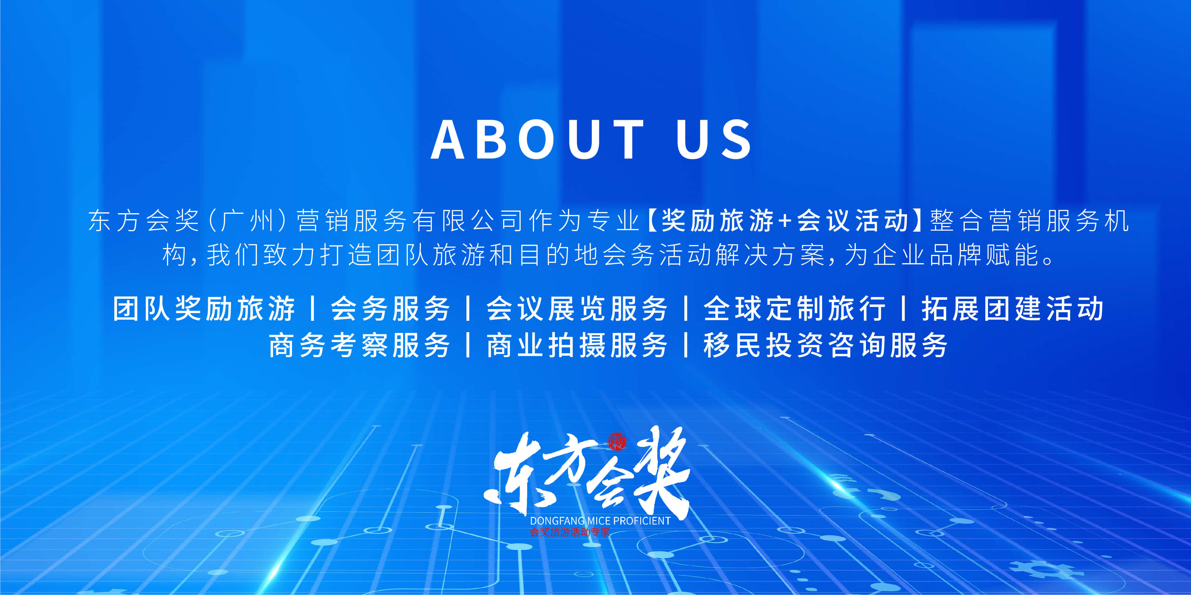 東方會獎(廣州)營銷服務(wù)有限公司 作為專業(yè)會獎旅游活動專家,我們致力打造專業(yè)團(tuán)隊(duì)旅游和目的地會務(wù)會展解決方案,為企業(yè)品牌賦能。 基于對商業(yè)客戶需求的深刻理解和豐富的服務(wù)經(jīng)驗(yàn),東方會獎成功實(shí)現(xiàn)從單一服務(wù)到整合服務(wù)、從簡單服務(wù)到高附加值服務(wù)、從線下服務(wù)到覆蓋線上線下的整合營銷服務(wù)布局,旗下東方會獎、途蘭朵旅行、左契文化、途蘭朵科技、全球開拓者等各業(yè)態(tài)的專業(yè)子公司相繼成立。目前,東方會獎已經(jīng)在中國主要經(jīng)濟(jì)區(qū)域建立了完善的服務(wù)網(wǎng)絡(luò),覆蓋廣州、深圳、佛山、杭州、成都、貴陽、西安、福州、廈門、桂林、長沙等核心城市。 成立至今,東方會獎一直專注于為新零售、保險、金融、直銷等機(jī)構(gòu)客戶提供“一站式”整合營銷服務(wù),業(yè)務(wù)涵蓋:團(tuán)隊(duì)獎勵旅游,目的地會務(wù)服務(wù),會議展覽服務(wù),全球定制旅行,拓展團(tuán)建活動,商務(wù)考察服務(wù),專業(yè)旅行拍攝服務(wù)。為企業(yè)品牌實(shí)現(xiàn)真正的全案整合營銷。